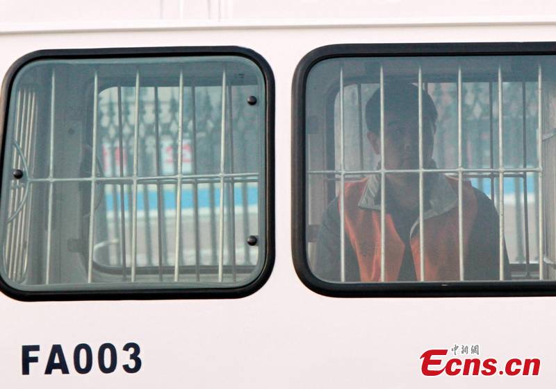 "Golden whistle" Lu Jun, used to be the best-known referee in the country, sits in a paddy wagon to head for the Intermediate People's Court of Dandong in northeastern China's Liaoning Province, December 21, 2011. A number of suspects including Zhang Jianqiang, the former director of the Chinese Football Association (CFA)'s referee committee, several general managers of football clubs, and referees stand trial in a bribery and corruption case. [CNS Photo/Yu Haiyang]