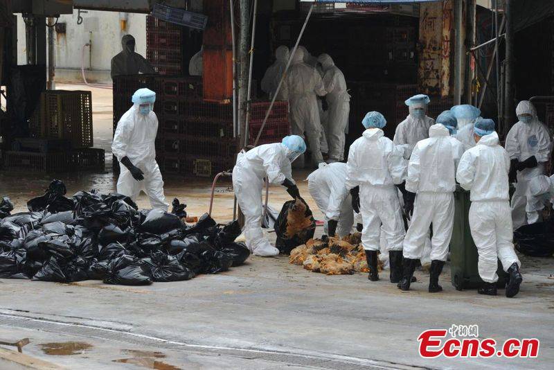 Workers put dead chickens into plastic bags at a poultry market in Hong Kong, December 21, 2011. A killing of more than 17,000 chickens started here after a chicken carcass was tested positive for the H5N1 avian influenza virus. [ICPress Photo]