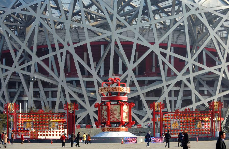 Photo taken on Dec. 28, 2011 shows the red lantern decorations outside the National Stadium, also known as the Bird's Nest, in Beijing, capital of China. Four sets of New Year decorations including red lanterns and Chinese folding fans have been placed in the Olympic Park of Beijing recently to greet the coming New Year and the Spring Festival. (Xinhua)