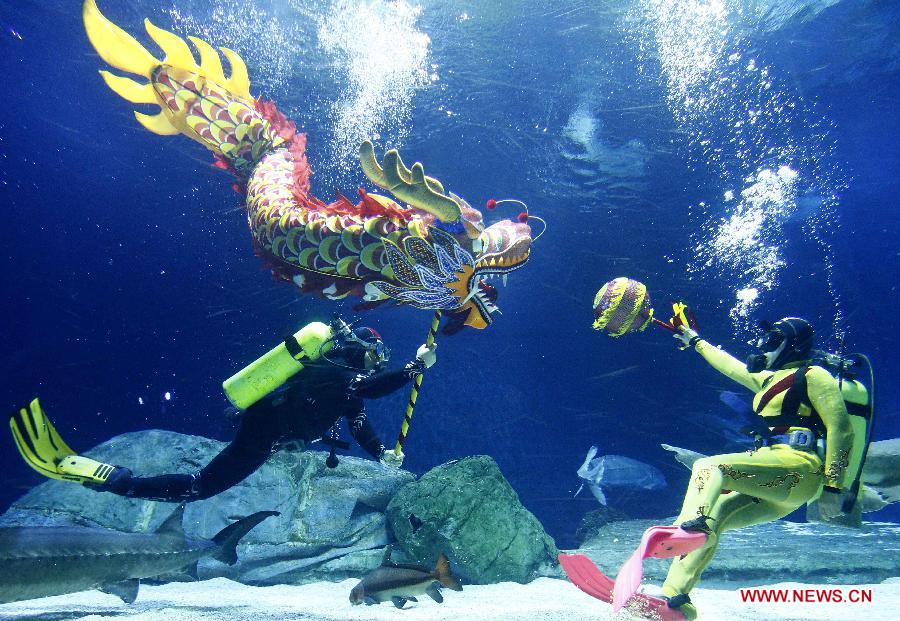 Divers perform dragon dance at an aquarium during an event to welcome the Year of Dragon in Beijing, capital of China, Jan. 5, 2012. (Xinhua/Chen Jianli)