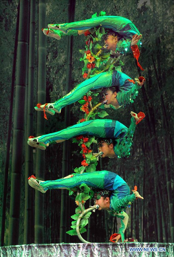 Handicapped children perform Chinese acrobatics in Zhengzhou, capital of central China's Henan province, Jan. 9, 2012. Local handicapped children performers made a debut of their pantomine named Chasing the Sun here on Monday. (Xinhua/Wang Song)