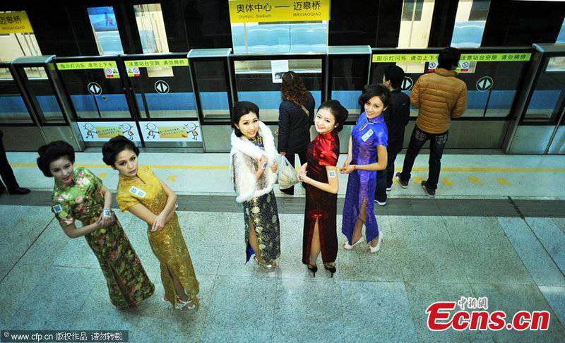 Models in Qipao, or traditional Chinese gowns, walk in subway trains in Nanjing, capital of east China's Jiangsu Province, January 11, 2012. [CFP Photo]