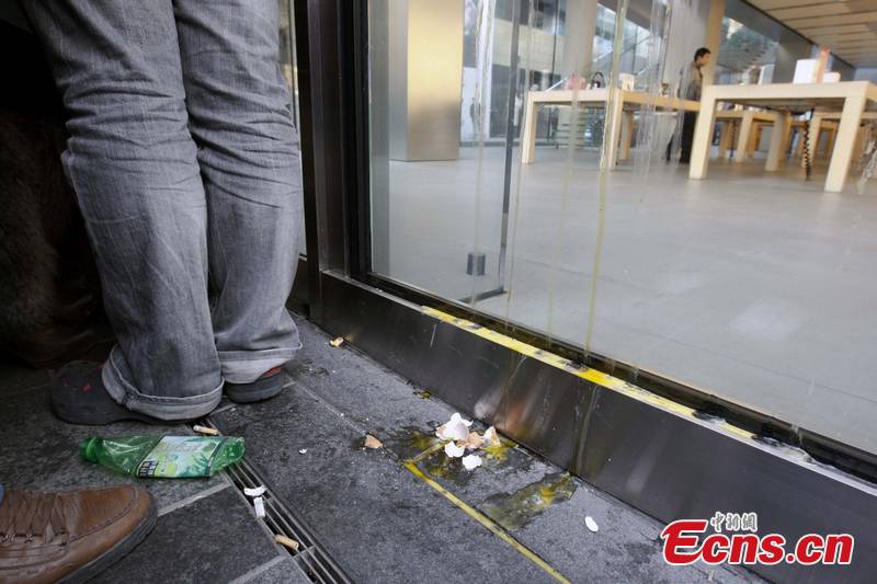 The photo taken on January 13, 2012 shows eggs thrown at the window doors of an Apple store in downtown Beijing on the morning of January 13, 2012. Large crowds, including a huge number of scalpers, waited all night outside the flagship shop in Sanlitun area for the release of iPhone4S. [CNS Photo/Zhang Hao]