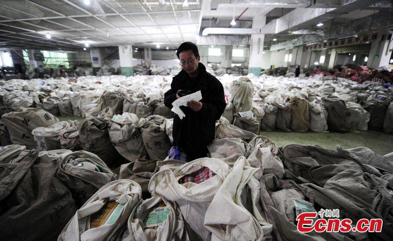 A Worker of an express company sorts out packages in southwest China's Chongqing Municipality, January 15, 2012. As the Spring Festival draws near, warehouses of local logistics companies are packed of boxes. [ICPress]