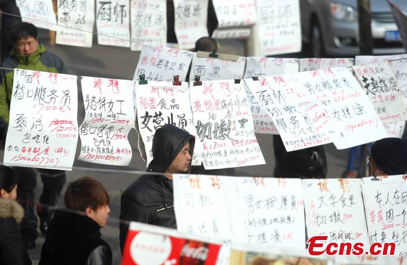 People look for jobs at a labor market in Harbin, capital of northeast China's Heilongjiang Province, January 29, 2012. [CNS Photo/Jing Yang]