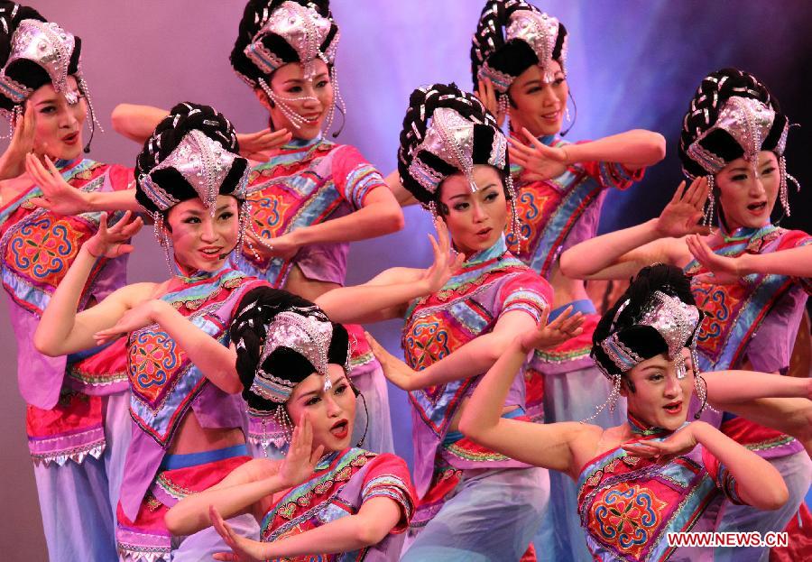 Chinese artists perform a traditional dance at the National Theater in San Jose, capital of Costa Rica, on Jan. 31, 2012. (Xinhua/Kent Gilbert)