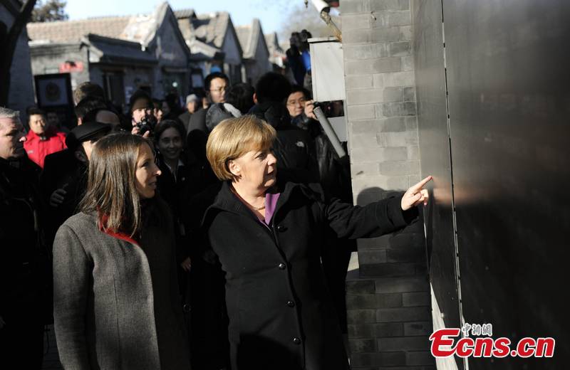 German Chancellor Angela Merkel visits the cultural Nanluoguxiang street in Beijing on the afternoon of February 2, 2012. [CNS Photo/Liu Zheng]