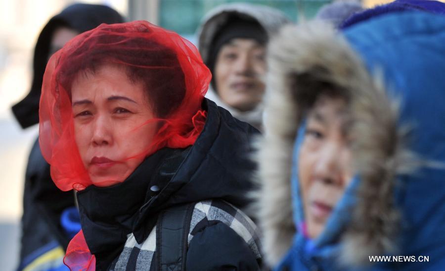 Pedestrians walk in gale on a street in Beijing, capital of China, Feb. 6, 2012. A cold wave swept Beijing on Monday, with the lowest temperature expected to drop to minus 12 degrees Celsius. (Xinhua/Li Wen)