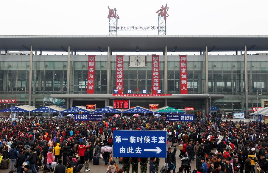 Passengers cram the square of Chengdu Railway Station in Chengdu, capital of southwest China's Sichuan Province, Feb. 8, 2012. Chengdu Railway Station witnessed a new round of travel rush for the end of the Lantern Festival holiday as many migrant workers and students came back to cities. From last Sunday, nearly 90,000 passengers boarded trains at Chengdu Railway Station per day and the travel rush was expected to last till early March. (Xinhua/Xue Yubin)