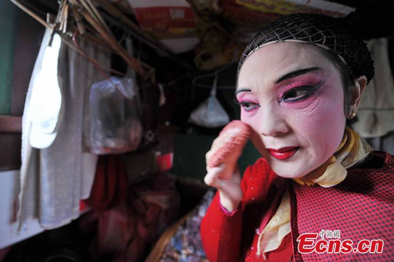 Zhang Susu, mainstay of the Dongshou troupe of Chinese Yueju Opera, puts on makeup in the dimly lighted cabin. The 16-performer troupe is on all-year-round boat tours among townships and villages of Shaoxing, east China's Zhejiang Province. [CNS Photo/Yuan Yun]