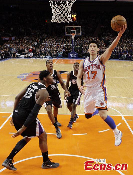 Jeremy Lin only scores 10, but has a career-best 13 assists as the New York Knicks roll past the Kings 100-85 for their seventh consecutive win, February 15, 2012. [Photo:agencies]