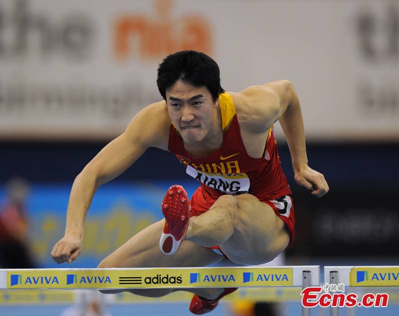 China's Liu Xiang crosses a hurdle during the men's 60m final at the Birmingham indoor tournament, February 18, 2012. Liu Xiang beats arch rival Dayron Robles of Cuba in his personal best time of 7.41 seconds to win the men's 60m hurdles final, and breaks Asian record. [Photo: agencies]
