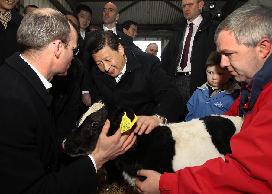 Chinese Vice President Xi Jinping (2nd L, front) and Irish Agriculture, Food and Marine Minister Simon Coveney (1st L, front) view a calf at a farm in Shannon, Ireland, Feb. 19, 2012. Xi Jinping visited James Lynch's farm in a suburb of Shannon on Sunday. (Xinhua/Lan Hongguang)