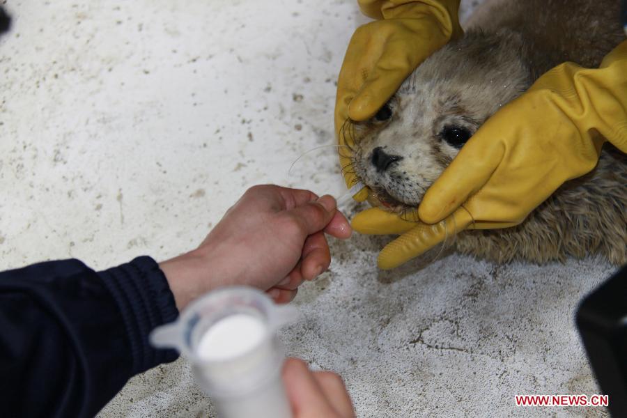 Two keepers feed milk to a deserted baby seal at the Sun Asia Ocean Park in Dalian City, northeast China's Liaoning Province, Feb. 21, 2012. The keepers here have to act as "mothers" of the baby seal, who was deserted and assaulted by its mother. (Xinhua/Yan Ping)