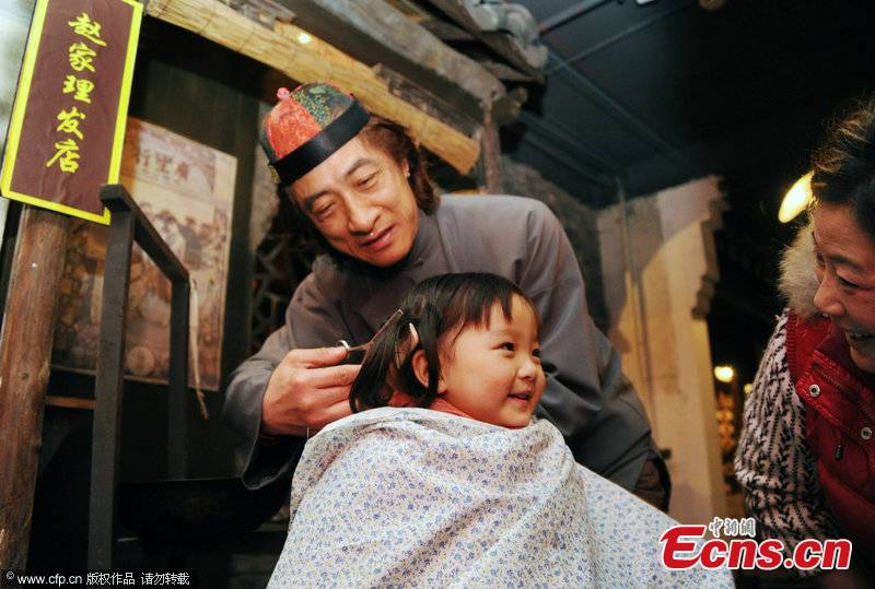A girl has her hair cut at a barber's in eastern China's Shanghai, February 23, 2012. The second day of the second lunar month is traditionally believed as an auspicious time when "the dragon lifts its head", meaning creatures awake from a long, bitter winter. [CFP Photo]
