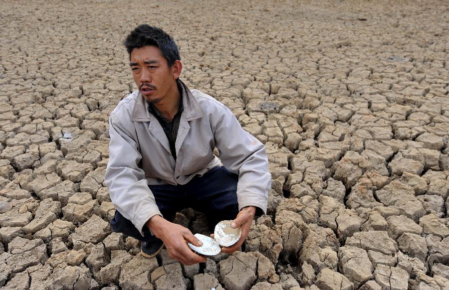 Villager Yang Jiawei holds a mussel shell on a parched pond at Benzhai Village in Shizong County, southwest China's Yunnan Province, Feb. 22, 2012. Since December, the persistent drought in Yunnan has affected more than 6 million people, leaving at least 2.4 million people and 1.5 million livestock short of drinking water, said the Ministry of Finance and the Ministry of Civil Affairs on Wednesday. (Xinhua/Lin Yiguang)