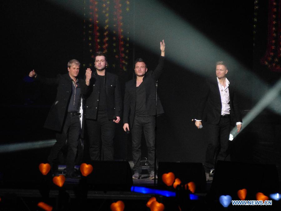 Irish boy band Westlife sings during a concert marking the beginning of their farewell tour in Beijing, capital of China, Feb. 22, 2012. (Xinhua/Ding Ming)