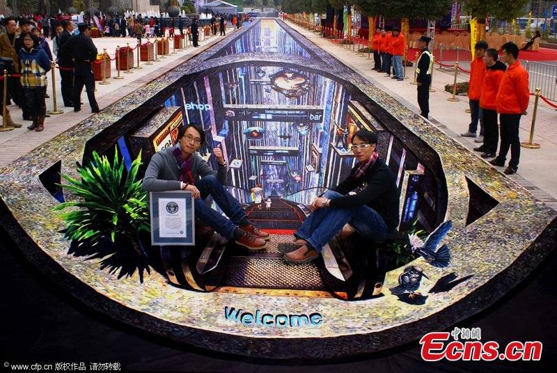 A 148.63-meter long 3D street painting by the Wan brothers sets a new Guinness World Record, in Guangzhou, capital of south China's Guangdong Province, February 20, 2012. [CFP Photo]