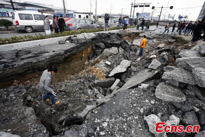 A road collapse leaves a 3-meter-deep hole that runs nearly 100 meters on the surface of a section close to the Hangzhou Bus Terminal Center of Subway Line 1, capital of east China's Zhejiang Province, February 27, 2012. [CFP Photo]