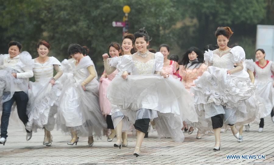 Women wearing bride costumes and high-heeled shoes take part in a running contest to greet the upcoming International Women's Day in the Colorful World Park of Changsha, capital of central China's Hunan Province, March 1, 2012. (Xinhua/Li Ga)