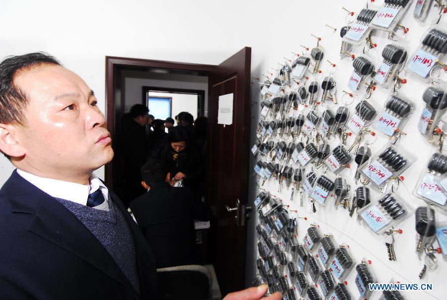 A staff member of Nanhu Xincheng, a new public rental community, prepares to deliver keys to tenants in Wuhan, capital of central China's Hubei Province, March 5, 2012. The city has assigned its first 900 public rental apartments to citizens in need, who moved into new homes here on Monday. (Xinhua/Xiao Yijiu)