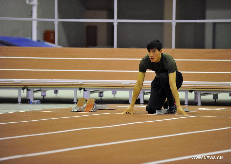 Chinese athlete Liu Xiang exercises to prepare for the 2012 Indoor Track and Field World Championships in Istanbul, Turkey, March 7, 2012. (Xinhua/Ma Yan)