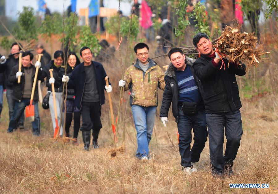 People carry shovels to plant trees on the 34th national Tree Planting Day in Wuhan, capital of central China's Hubei Province, March 12, 2012. (Xinhua/Cheng Min)