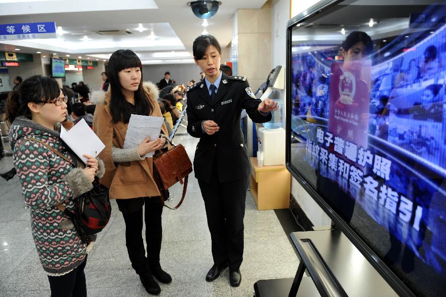 A working staff introduces electronic passport application procedures to citizens at reception hall of the exit-entry administration organ in Qingdao, a coastal city in east China's Shandong Province, March 15, 2012. Shandong began on Thursday to issue electronic passports containing electronic data storage chips, which can provide personal information such as photo and fingerprint, as an effort to foil forgers. (Xinhua/Li Ziheng)