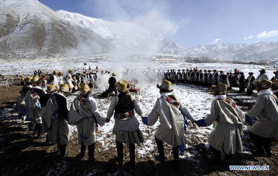 Farmers join in a spring ploughing ceremony in Maxiang Township, Doilungdeqen County, southwest China's Tibet Autonomous Region, March 16, 2012. Farmers in Maxiang Township held the annual ploughing ceremony to mark the beginning of spring sowing on Friday. (Xinhua/Purbu Zhaxi)