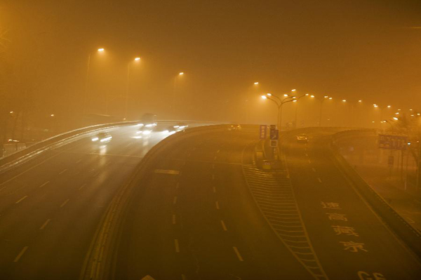 Vehicles move on a fog-shrouded road before dawn in Beijing, capital of China, March 17, 2012. The city was covered in fog on Saturday. (Xinhua/Wang Jingsheng)