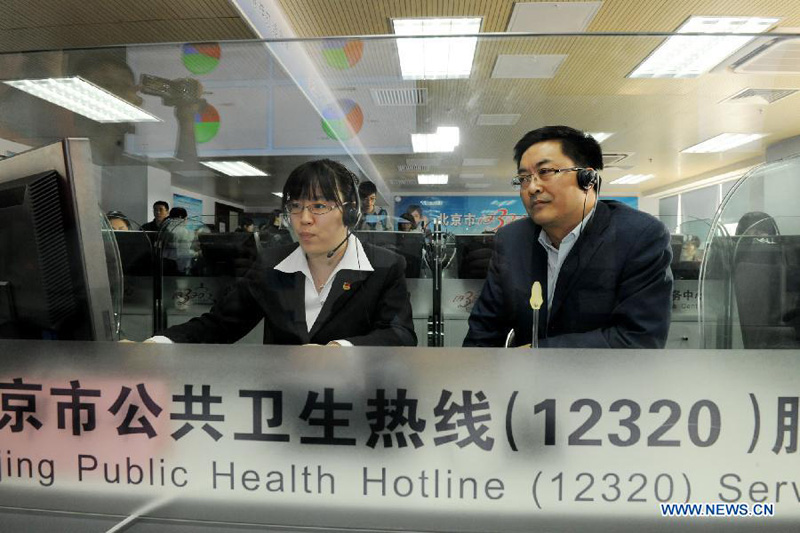 Deng Haihua (R), spokesman of China's Ministry of Health (MOH), receives phonecalls with a telephone operator of public health hotline 12320 in Beijing, capital of China, March 20, 2012, an experience day for citizens, who can sit down in the hotline office to receive phonecalls with operators. MOH will make effort to set up public health hotlines which provide services including infectious disease prevention and cure, health care consultation and public health legal consultation, in the provinces, municipalities and autonomous regions all over the county by the end of this year, said Deng. [Photo: Xinhua/He Junchang]
