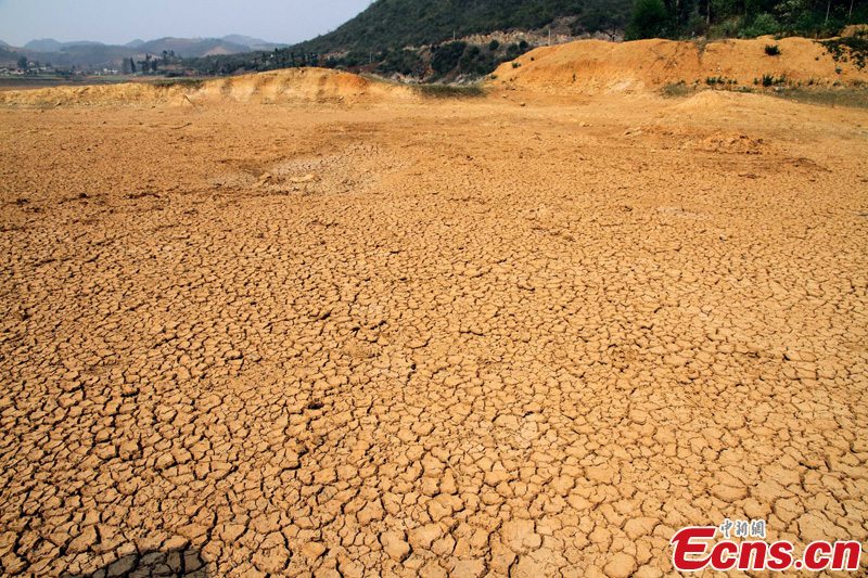 The Ganlongtan Reservoir in Tianxing Village, Qiubei Township, Yunnan Province is drying up as the province suffers from unrelenting drought for the third year in a row. Water storage in the reservoir has dropped from 300,000 cubic meters before the Spring Festival to around 50,000 cubic meters now, which can only provide drinking water for local resident for about one month. [Photo: CNS/Sun Zifa]