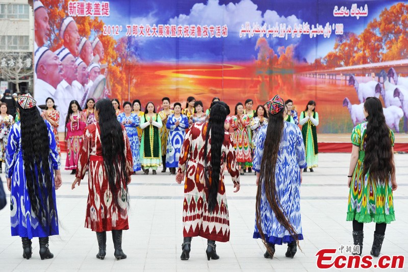 Women show off their long locks to the audience during a long hair competition held in Makit County, Kashgar Prefecture, Xinjiang Uyghur Autonomous Region on March 20, 2012. The participants also performed Daolang Dance—a popular local dancing—to celebrate the Nowruz, a festival that usually falls around March 21 each year. [Photo: CNS/Jin Wei]
