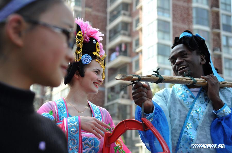 Two foreign students learn Huangmei Opera in Keqi Community of Hefei, capital of east China's Anhui Province, March 26, 2012. The community invited professional Huangmei Opera performers to give a lesson on Monday, to greet the World Theatre Day that falls on March 27. (Xinhua/Liu Junxi)
