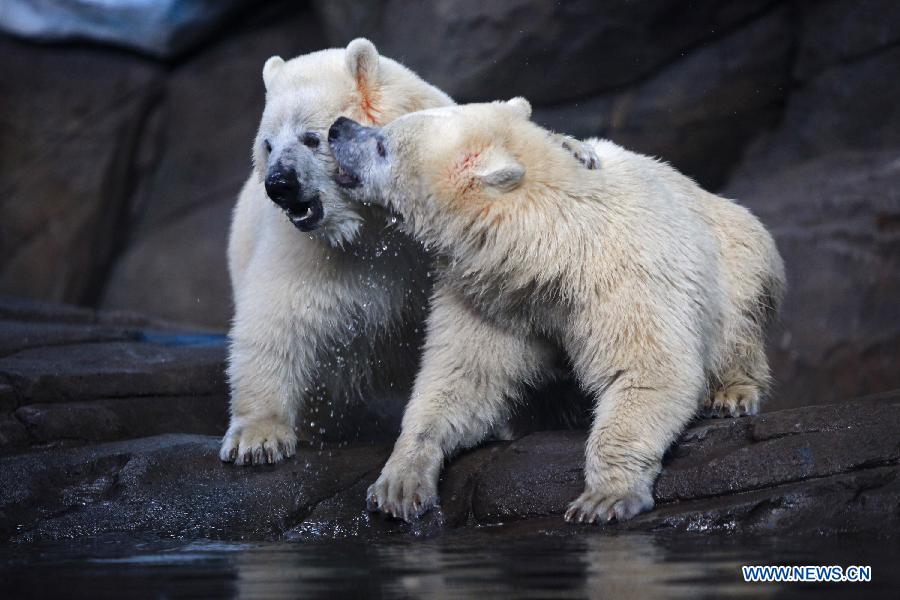 The twin polar bears Lele (L), a male cub, and Jingjing, a female cub, play beside a pool during a show-up to the public at a sea world in Wuhan, capital of central China's Hubei Province, March 27, 2012. Born in Dalian, northeast China's Liaoning Province, on Jan. 7, 2011, the twin polar bear cubs now settled in Wuhan and met the public on Tuesday. (Xinhua/Wang Zhenwu)