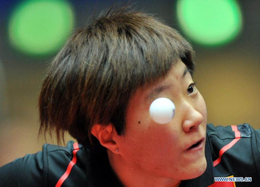 Guo Yan of China serves the ball during the Championship Division Group A match against Krisztina Toth of Hungary at the 2012 World Team Table Tennis Championships in Dortmund, Germany, March 27, 2012. Chinese women's team won 3-0. (Xinhua/Ma Ning)