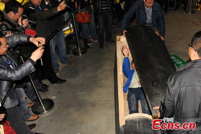 A visitor lies in a casket for one minute to experience what it is like to die at a funeral culture expo in Xi'an, capital of northwest China's Shaanxi Province, March 29, 2012. [CNS Photo/Zhang Yuan]