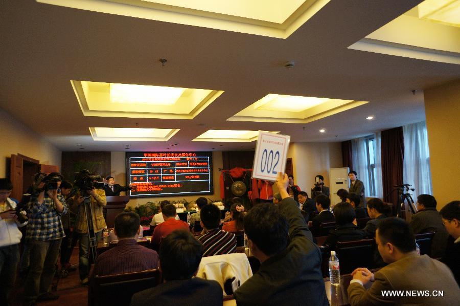 Bidders compete with each other during a Xihu Longjing tea auction held in Hangzhou, capital of east China's Zhejiang Province, April 5, 2012. The highest bidder at the auction offered to buy a portion of Mingqian Longjing, a premium variety produced from tender sprouts harvested before the Qingming Festival, at 60,000 yuan (9510 U.S. dollars) per kilogram. (Xinhua/Long Wei)