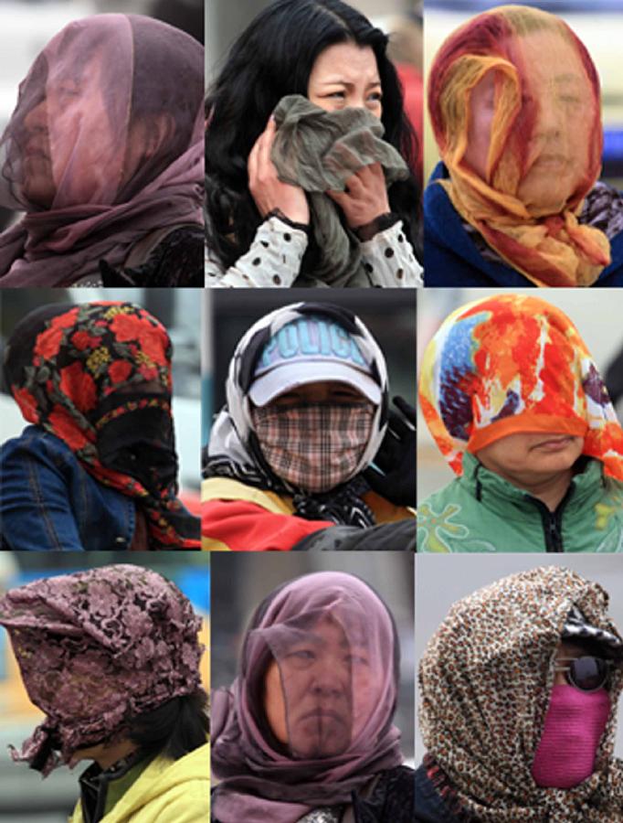 This combined photo taken on April 10, 2012 shows citizens walking in strong winds in Shenyang City, northeast China's Liaoning Province. Shenyang was hit by a windy and dusty weather on Tuesday. (Xinhua/Huang Jinkun)