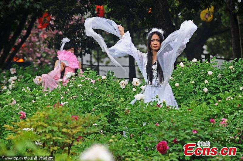 Male students dress up as cosplay girls perform at the East Lake Peony Garden in Wuhan, central China's Hubei Province, on the late afternoon of April 10, 2012. [CFP Photo]