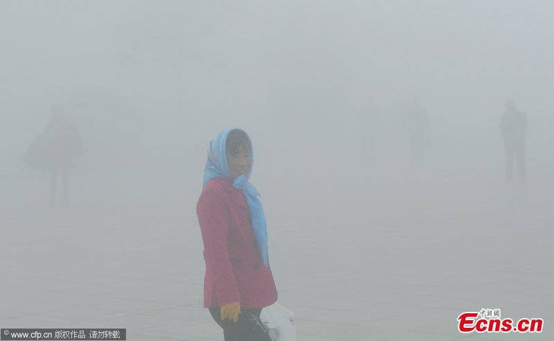 A woman walks on the fog shrouded street in Dalian, northeast China's Liaoning Province, April 13, 2012. [CFP Photo]