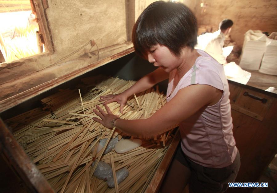 The sulphur for industrial use and soapstones are used for making disposable chopsticks at a workshop in Rongan County of Liuzhou, south China's Guangxi Zhuang Autonomous Region, April 11, 2012. Local government started inspections on disposable chopsticks manufacturers in Liuzhou City recently. Three companies were discovered and punished for using poisonous materials during the producing of chopsticks. (Xinhua/Tan Kaixing)