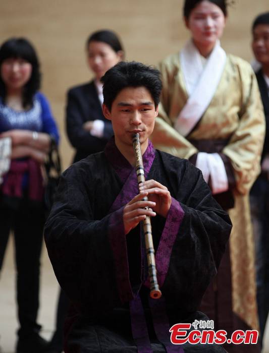 A Chinese ancient costume lover presents Han-style costume at the Luoyang Museum, central China's Henan Province, April 15, 2012. [CNS Photo/Gong Weidong]