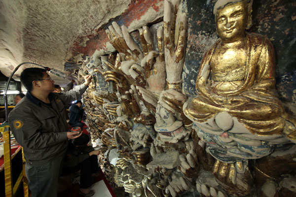 Workers repair the Thousand-Hand Guanyin (Avalokitesvara, also known as Goddess of Mercy) at the Dazu Rock Carvings, a UNESCO World Heritage site in Chongqing, on April 16, 2012. The restoration project started in April 2011, and 242 hands of the Thousand-Hand Guanyin have been repaired so far. [Photo by Luo Guojia / For China Daily]