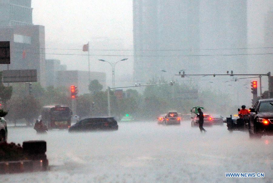 Pedestrians and vehicles are seen at a crossroad in Nanchang, east China's Jiangxi Province, April 24, 2012. Local meteorologic authority has issued an orange alarm for thunderbolt and a blue alarm for torrential rain. (Xinhua/Zhou Mi)