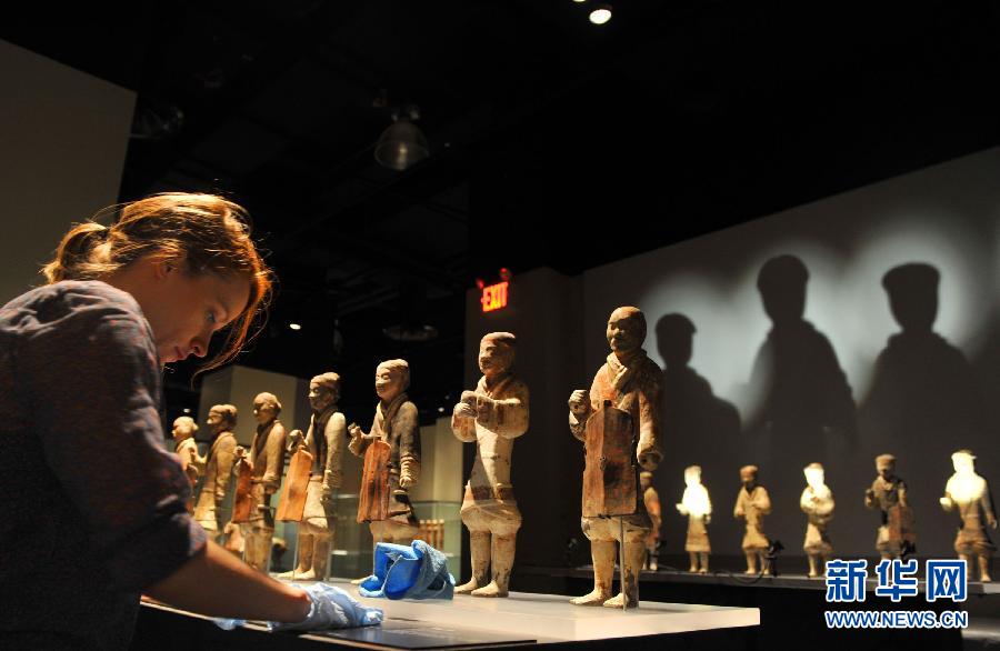 A staff member works at a preview of Terracotta Warrior-themed exhibition in New York, April 25, 2012. Visitors will experience the unique opportunity to see this showcase of nearly 100 Chinese artifacts from April 27th. [Xinhua Photo]
