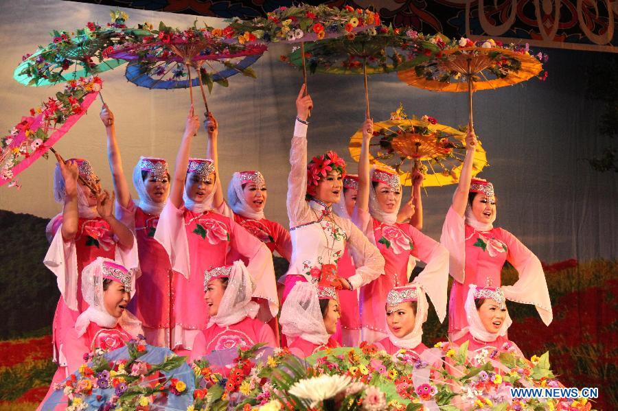 Actresses of a troupe from northwest China's Ningxia Hui Autonomous Region dance for audience in Dubai, the United Arab Emirates (UAE), on April 25, 2012. (Xinhua/Li Zhihui)