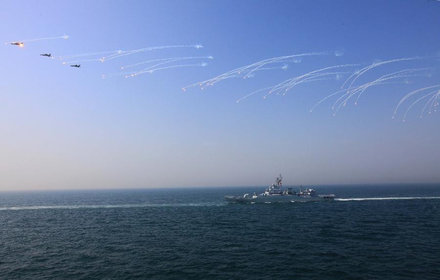 A naval vessel and aircrafts are seen during the fleet review of the Russia-China joint naval exercise in the Yellow Sea of the Pacific Ocean, April 26, 2012. Chinese and Russian warships concluded a live ammunition exercise on Thursday, following a no-weapon joint war game earlier the same day. (Xinhua/Zha Chunming)