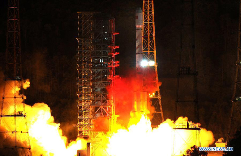 The Long March-3B rocket carrying two satellites blasts off from the launch pad at the Xichang Satellite Launch Center in Xichang, Southwest China's Sichuan Province, on April 30, 2012. China successfully launched two satellites into space Monday morning, the 12th and 13th of its indigenous global navigation and positioning network known as Beidou, or Compass system, the launch center said. [Photo: Xinhua/Tao Ming]