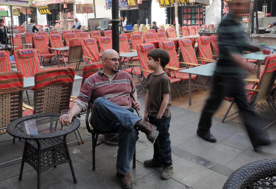 Kevin Gilley (L) talks with his son Nathan outside his coffee house in Dunhuang, northwest China's Gansu Province, April 27, 2012. Among the barbeque restaurants at the night fair in Dunhuang, a historic city in northwest China, a coffee house stands out. It sells coffee and pizza. Dunhuang is a famous tourist destination in Gansu Province, so the coffee shop attracts many customers. The owner of the coffee house are the Gilleys, an American couple. Kevin Gilley and Sheryl Gilley came to China in the 1990s and visited Dunhuang, and they were attracted by the historic relics and local culture. They came back again in November 2008 and opened the coffee house, named as Oasis Cafe, for the environment of Dunhuang. This was the first coffee house in Dunhuang opened by foreigners. "I hope I can run a coffee house in a city of China all along," Kevin said. "I think I've found the right one when I encountered Dunhuang, a small city with fabulous history and culture." The Gilleys were afraid that seldom people would come here at first. However, many local residents are interested in foreign drinks and food. After learning coffee culture in Oasis Cafe as customers, they opened their own cafes in Dunhuang. Furthermore, thousands of tourists from home and abroad visit the historic relic every year, bringing a great number of customers to the coffee house. "I'm glad that we can meet people with different cultural background here," Sheryl said. "It is like a small world." Oasis Cafe runs from 2:00 p.m. to the hour before dawn next day. Waiters here can speak English, while Gilleys can speak a little Chinese to customers. "I will stay here. Everything is fantastic except occasional sandstorms," Kevin said. "If I have another choice of settlement, the result is Dunhuang again." (Xinhua/Gao Jianju)